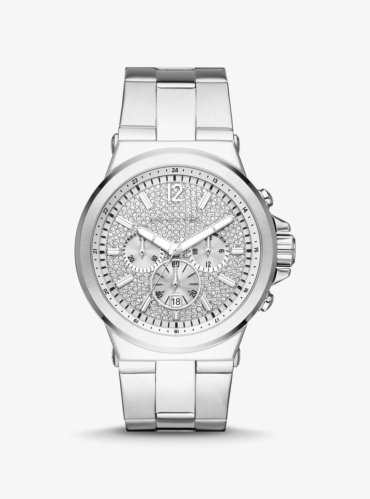 Big, bold, impossibly cool the Dylan watch will never go out of style. The oversized bezel and understated time-stops read sleek, while the silver-tone casebody, sparkling pav accents and bracelet strap feel sophisticated. Wear it to add a refined punctuation to everything in your wardrobe. | Oversized watch
