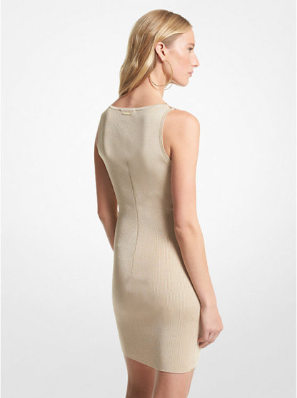 Slip on this tank dress for an instantly pulled-together look. Allover ribbing enhances the close fit of the metallic stretch viscose, while the flattering square neckline falls to a mini hem. Play up the glamour factor with high-shine accessories.