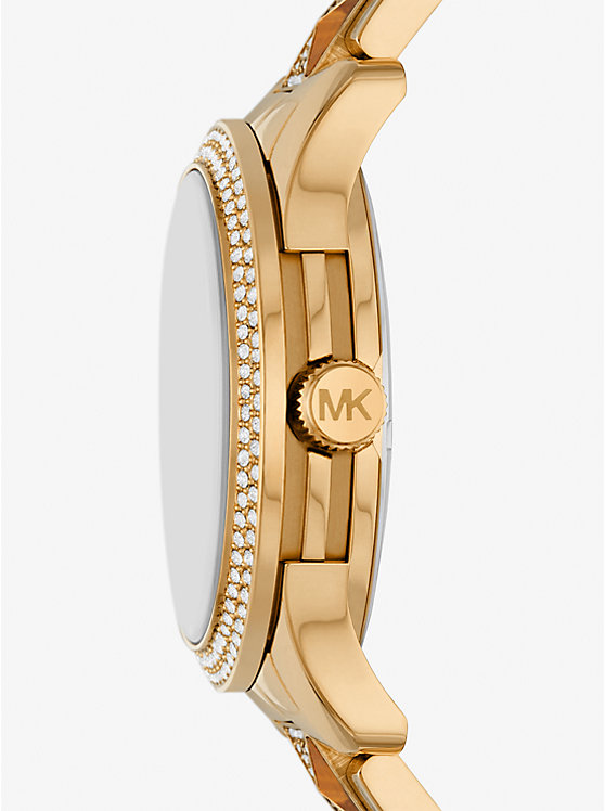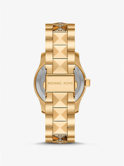 This Runway watch is a dazzling interpretation of our perennial favorite. Crafted from gold-tone stainless steel, it features a tiger’s eye dial and faux center links illuminated by pavé accents on the bezel and bracelet. Reach for it to give your evening look an extra hit of color.